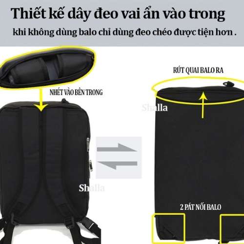 ⇒ Quai xách khi xách không mang balo , có thể dán vào nhau khi xách gọn hơn trong lòng tay, khi không xách đeo balo có thể nhét gọn vào ngăn chứa